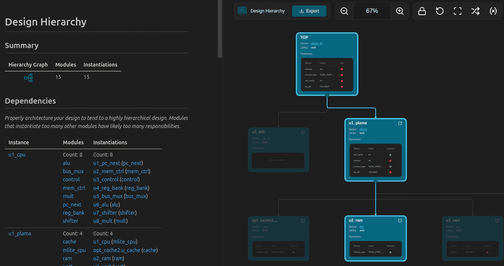 Quickly understand your design and investigate issues through graphs and reports: Design hierarchy, CDC, RDC, FSM, etc.